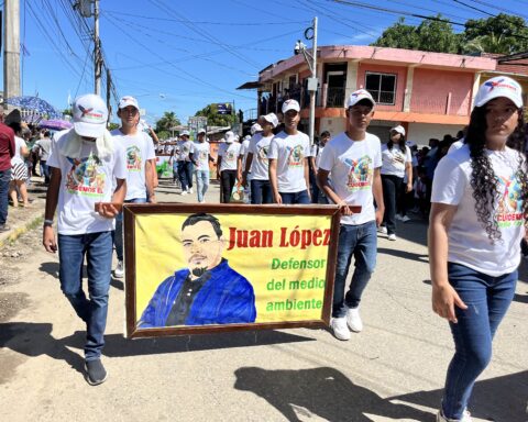 Saba,Colón – Un grupo de jóvenes del Instituto 4 de septiembre portaron una manta con la imagen de Juan López defensor del medio ambiente , como un homenaje a este personaje del departamento de Colón . Los jóvenes también promovieron la defensa