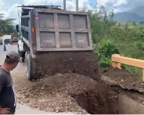 Olanchito ,Yoro – Ante la indiferencia del Gobierno , la Alcaldía de este Municipio, realizó la reparación de un enorme agujero que se había formado a inmediaciones del puente sobre el río Aguan . Con maquinaria de la Alcaldía se procedió a