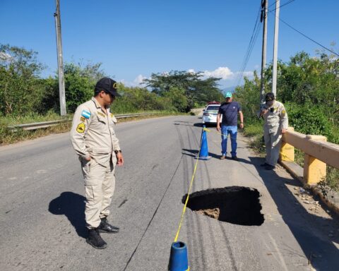 Olanchito ,Yoro – En un peligro se ha convertido para los conductores en una zona del puente Aguan en la salida a Saba ,donde hay un enorme agujero. Elementos del cuerpo de bomberos colocaron señales y cerraron una vía para evitar que