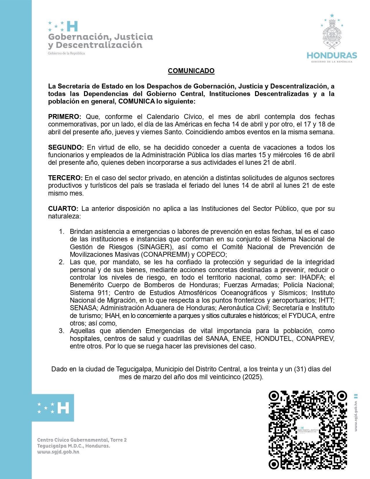 Tegucigalpa.- Empleados gubernamentales se van de Feriado toda la Semana Santa, el asueto comienza desde el 14 de abril, regresando a sus funciones el lunes 21 de abril.