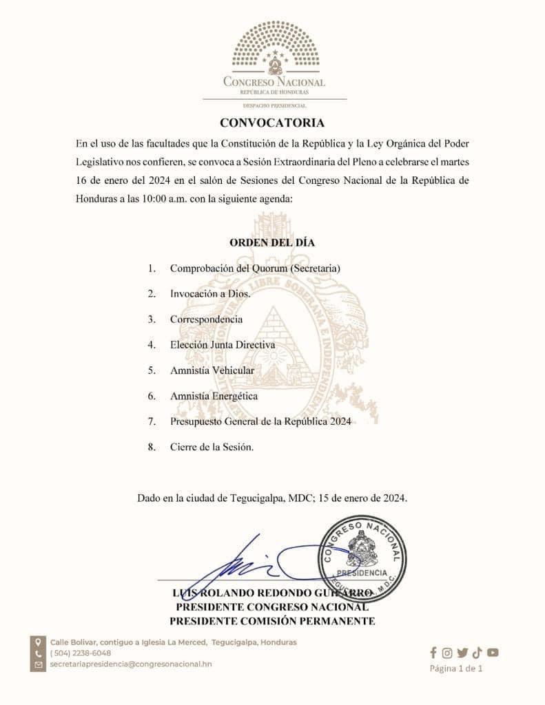 Tegucigalpa.-Después de seis meses sin producción legislativa, Luis Redondo convoca a sesión extraordinaria para este martes, 16 de enero a las 10:00 am, la convocatoria fue firmada como presidente del Congreso Nacional y presidente de la comisión permanente.