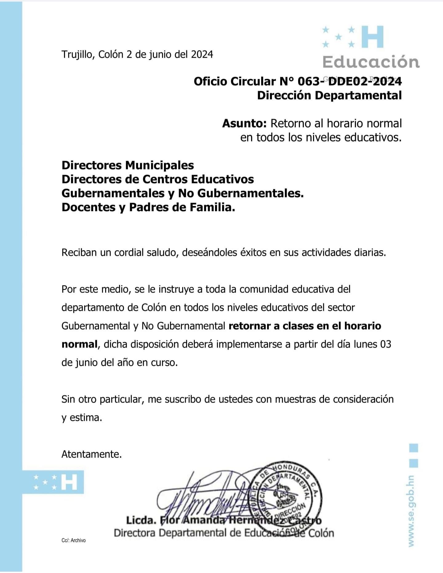 Trujillo,Colón- Mediante un comunicado la Dirección de educación departamental de Colón informó que retorna el horario normal de clases ,después de la temporada de calor .