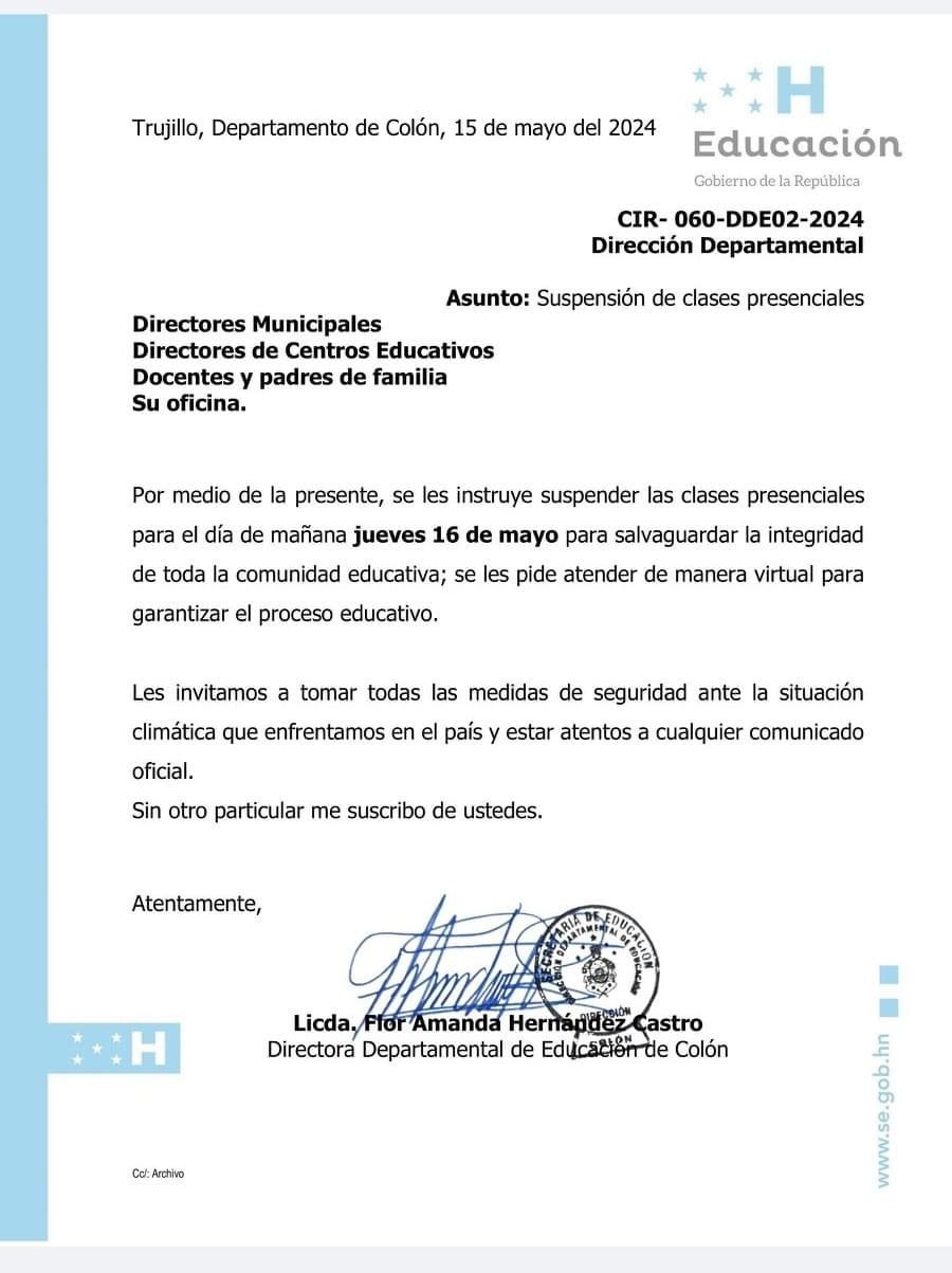 Trujillo,Colón – En un comunicado urgente la Dirección Departamental de Educación suspendió las clases para este jueves 16 de mayo debido a la alerta roja que emitió Copeco para toda la zona por la ola de calor.
