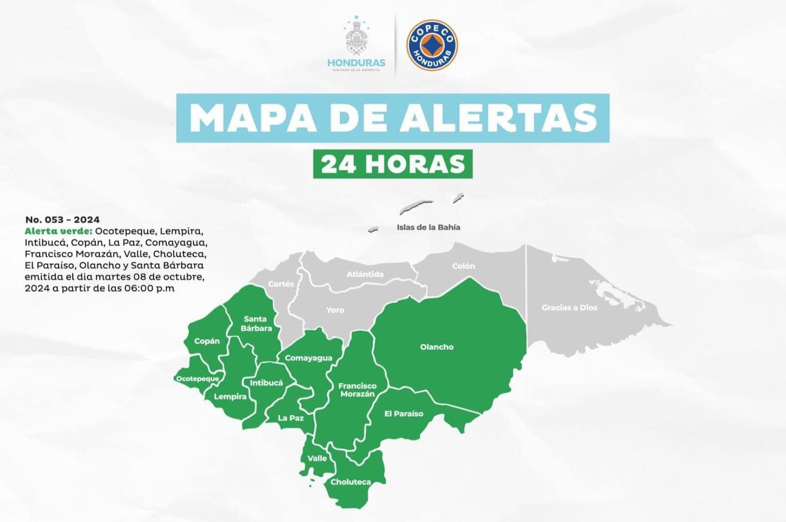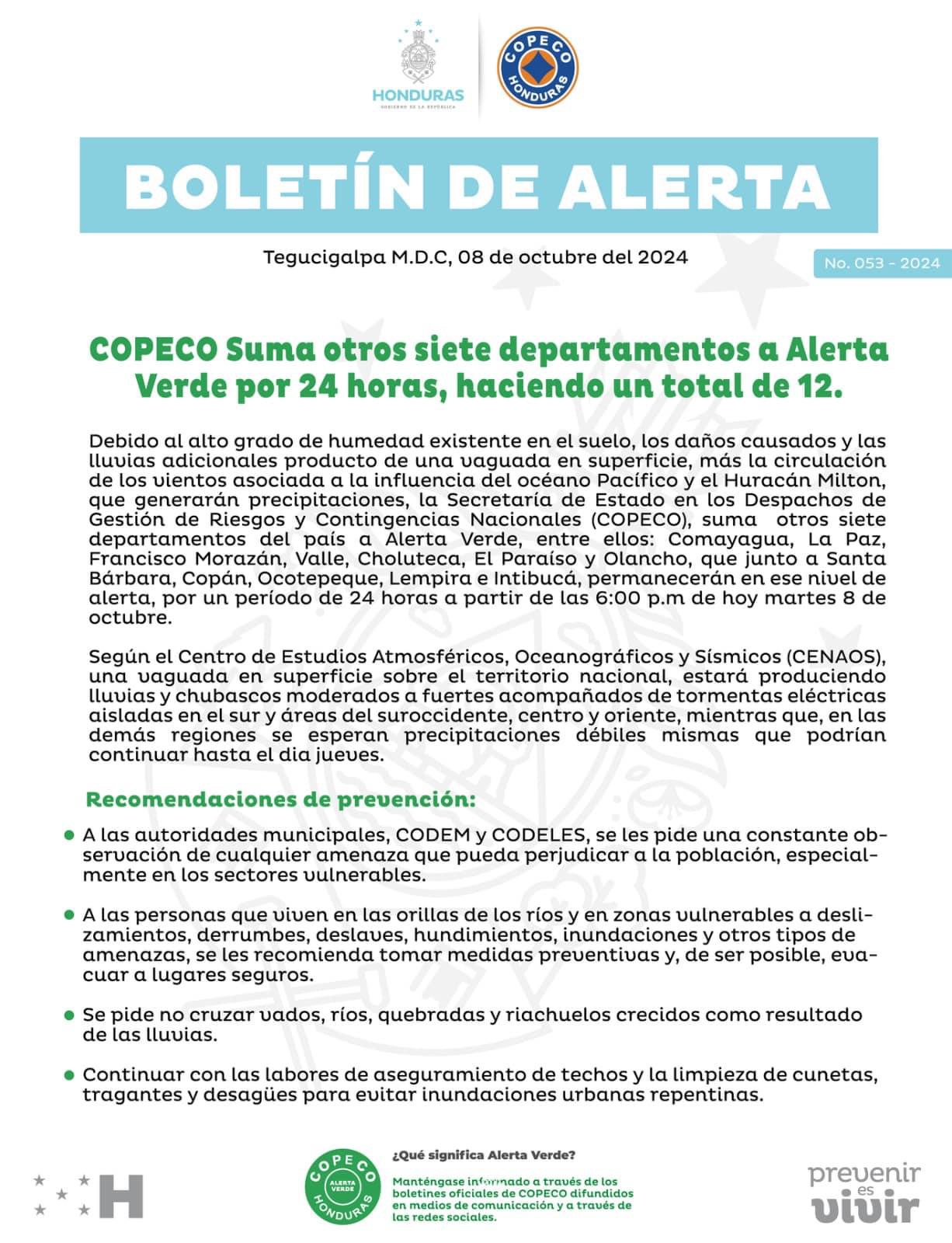Tegucigalpa – Por fuertes lluvias, COPECO emite por 24 horas Alerta Verde en Francisco Morazán, Comayagua, Valle, Choluteca, Intibucá, La Paz, Lempira, Ocotepeque, Olancho, El Paraíso, Santa Bárbara y Copán.