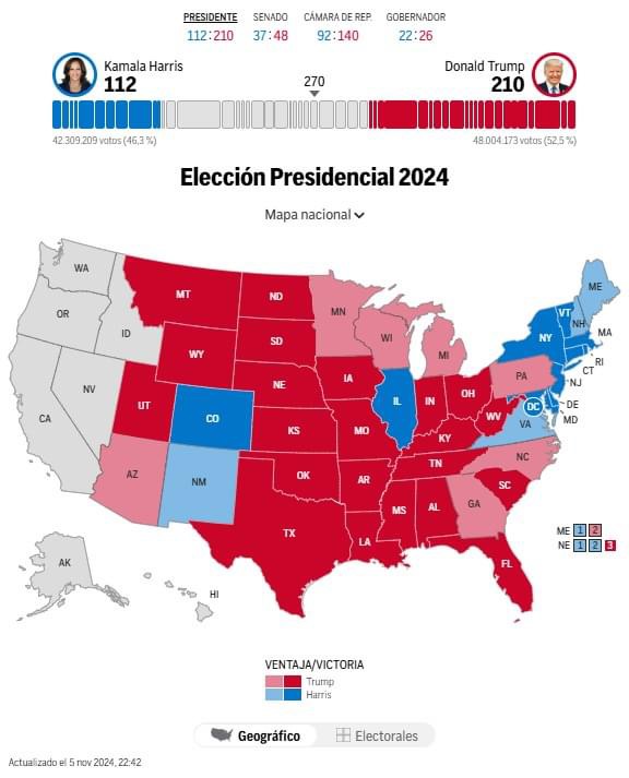 Internacionales/PortadaDonald Trump amplía su ventaja by Redacción - H6 de noviembre de 2024571 views1 min readElecciones Estados Unidos – | Donald Trump amplía su ventaja. Así van los resultados de las Elecciones Presidenciales de Estados Unidos 2024:Donald Trump: 210 Kamala Harris: 112 Share this Facebook Messenger Whatsapp Email