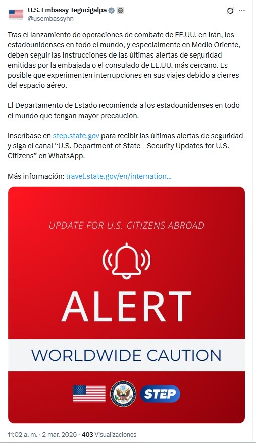 La Embajada de Estados Unidos en Honduras informó, a través de su cuenta oficial en la red social X, que tras el lanzamiento de operaciones de combate estadounidenses en Irán se emitieron recomendaciones de seguridad dirigidas a ciudadanos estadounidenses en todo el mundo.