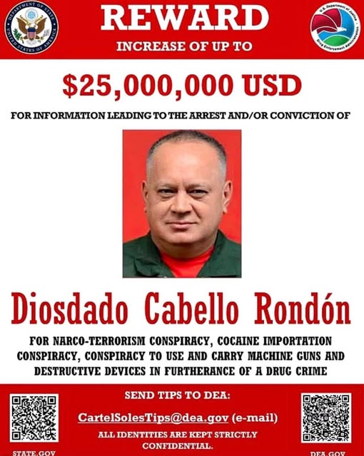 Según las autoridades estadounidenses, Cabello estaría involucrado en actividades que contravienen las leyes internacionales, incluyendo casos relacionados con narcotráfico y corrupción. La actualización del cartel implica recompensas para quienes proporcionen información que conduzca a su captura o investigación.