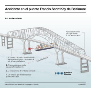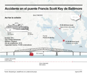 Un buque, propiedad de las compañías Grace Ocean Private Limited y Synergy Marine PTE LTD, impactó contra el puente Francis Scott Bridge en la ciudad costera de Baltimore a finales de marzo, provocando su caída y acabando con la vida de seis trabajadores del sector de la construcción que hacían labores de reparación en la carretera.