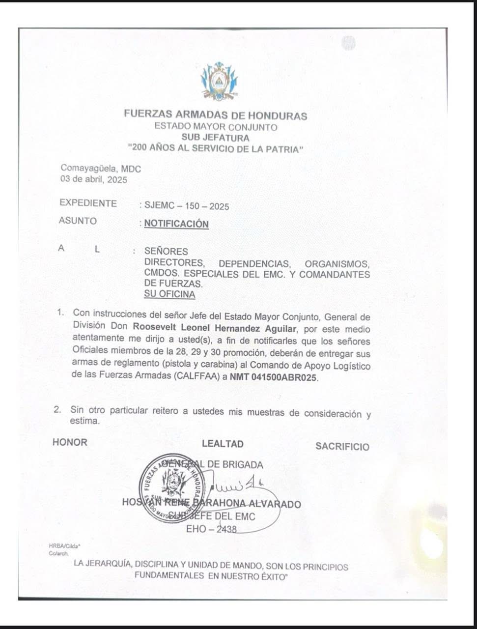 Tegucigalpa – A través de una circular, el jefe del Mayor Conjunto, Roosevelt Hernández, solicitó el jueves a los oficiales de la 28, 29 y 30 promoción de las Fuerzas Armadas hacer entrega de sus armas de reglamento (pistola y carabina) al Comando de Apoyo Logístico de las Fuerzas Armadas (CALFFAA).