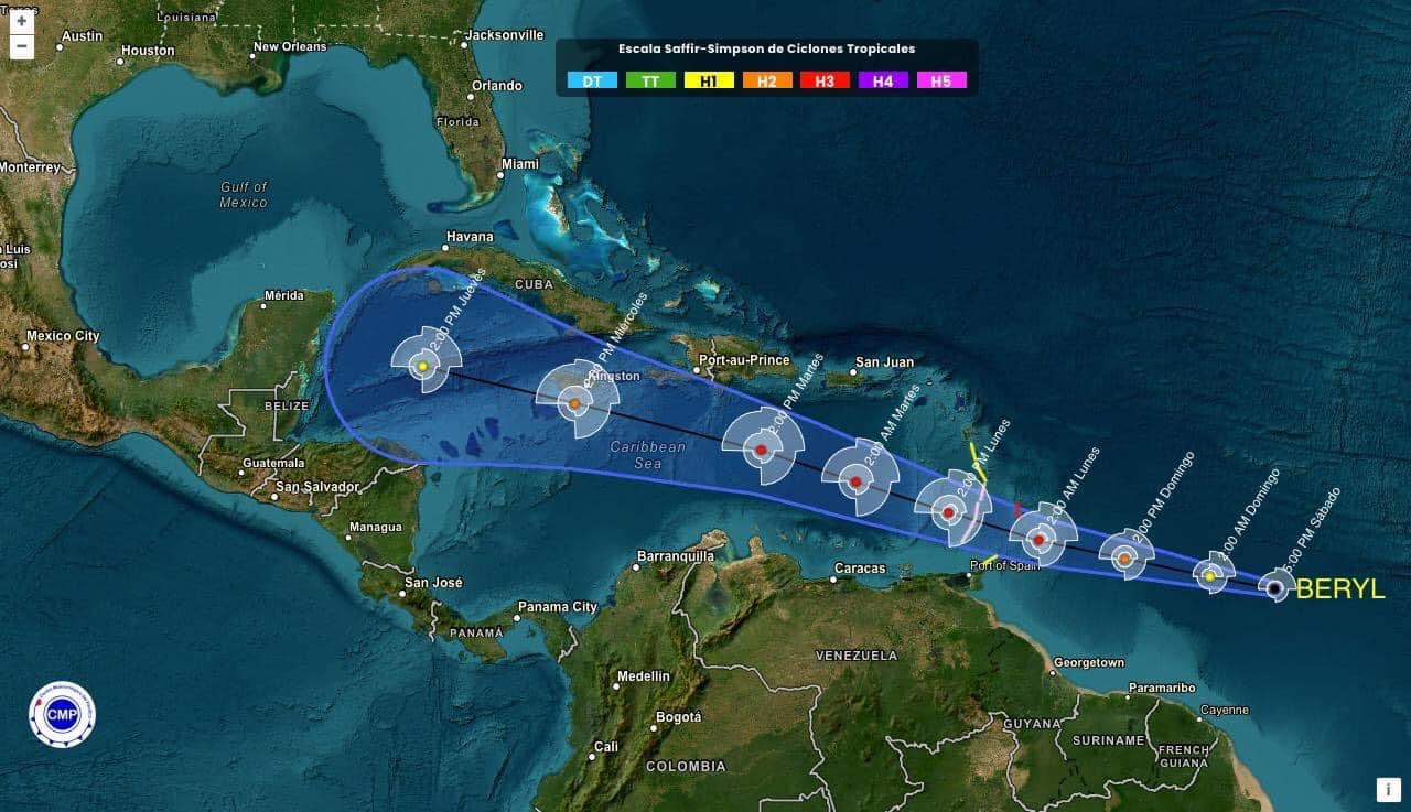 De acuerdo con el pronóstico del SMN, Beryl se intensificaría hasta la categoría 3 el lunes la madrugada del martes próximo; sin embargo, ahora las autoridades esperan que sea este lunes cuando alcance la categoría 4.