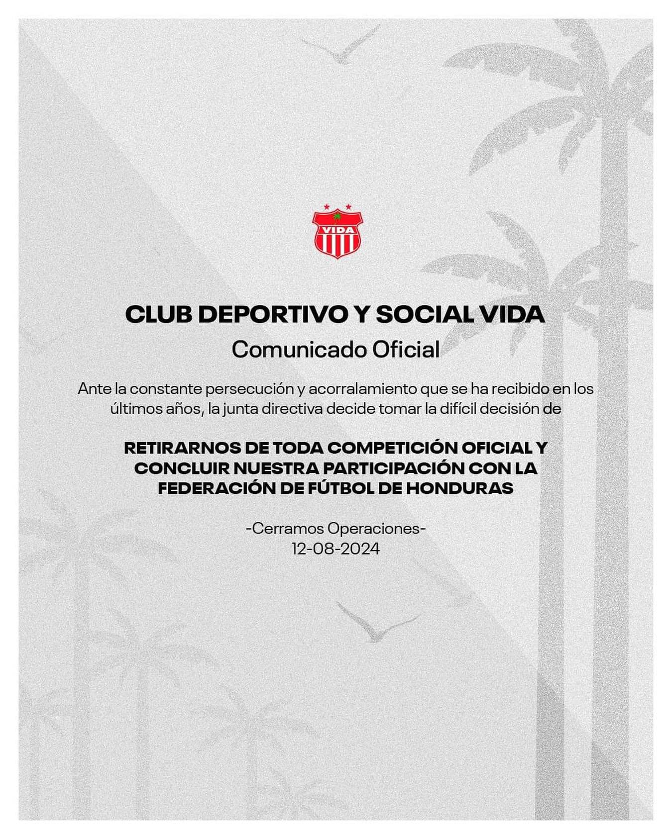 En un anuncio que ha conmocionado a la comunidad futbolística de Honduras, el Club Deportivo y Social Vida ha decidido retirarse de todas las competencias oficiales y concluir su participación con la Federación de Fútbol de Honduras. Esta decisión ha sido tomada por la junta directiva del club, que ha señalado una «constante persecución y acorralamiento» en los últimos años como las razones fundamentales detrás de esta medida.
