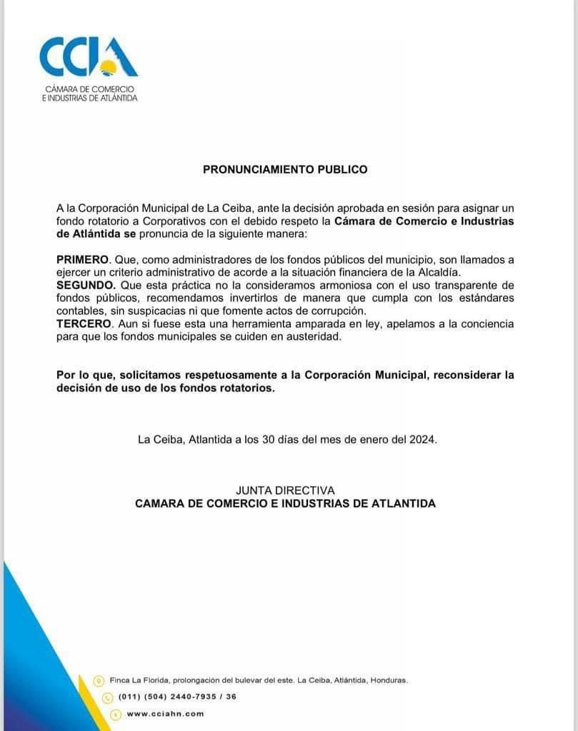 La Ceiba.- Empresarios se pronuncian en contra del subsidio aprobado para el alcalde (L80,000) y regidores (L40,000), la Cámara de Comercio afirma que esta práctica “no la consideramos armoniosa con el uso transparente de fondos públicos”.