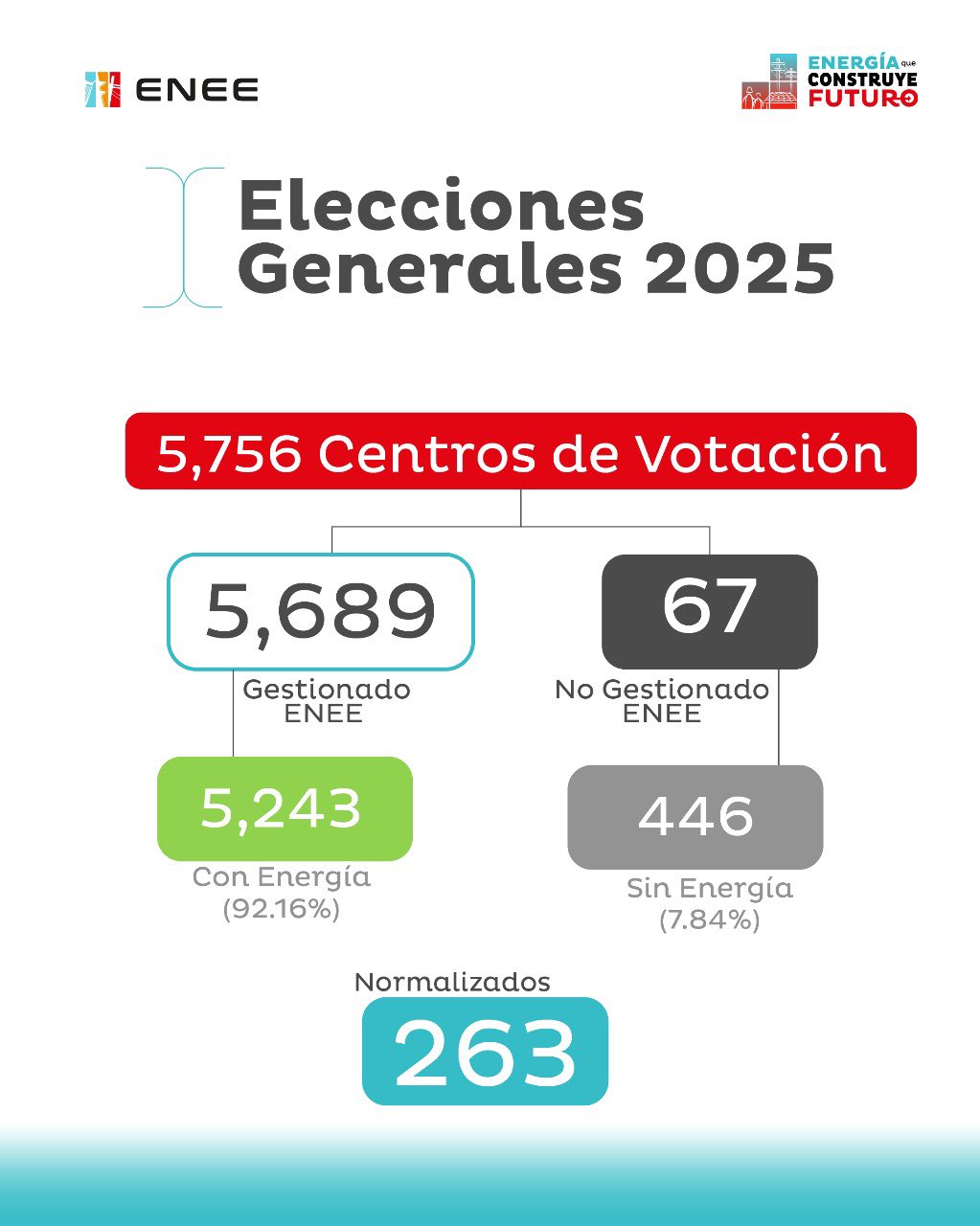 “En síntesis, 92 % de los centros de votación tendrán energía, gracias a la acción de la ENEE-UTCD que normalizó 263 CV”, destacó Tejada, garantizando que la mayoría de los votantes tendrán acceso a centros con suministro eléctrico durante los comicios.