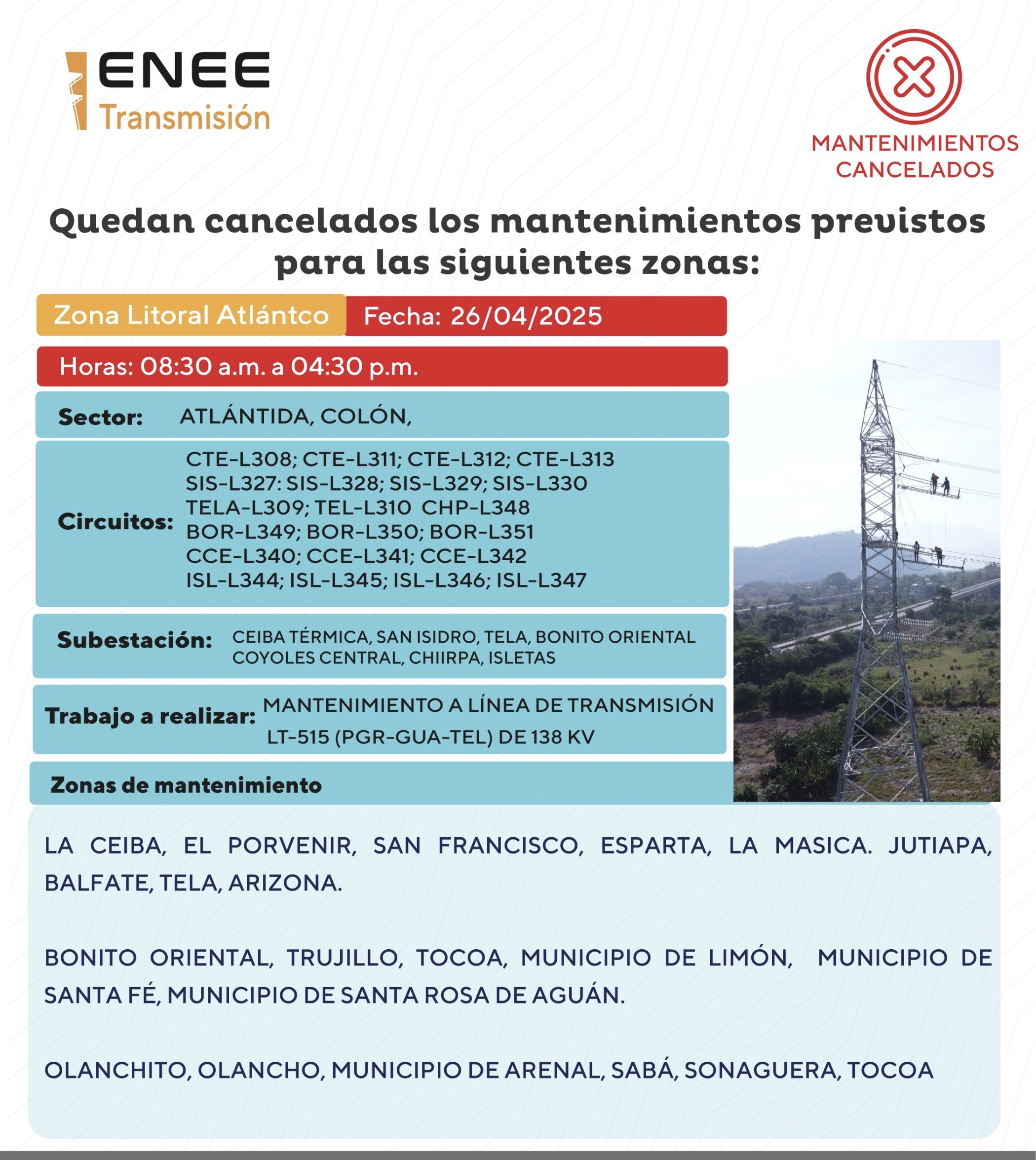 La Ceiba -La ENEE suspende mantenimiento que estaba programado para el sábado en todo el Litoral Atlantico, ante la solicitud presentada por el Club Rotario de Olanchito .