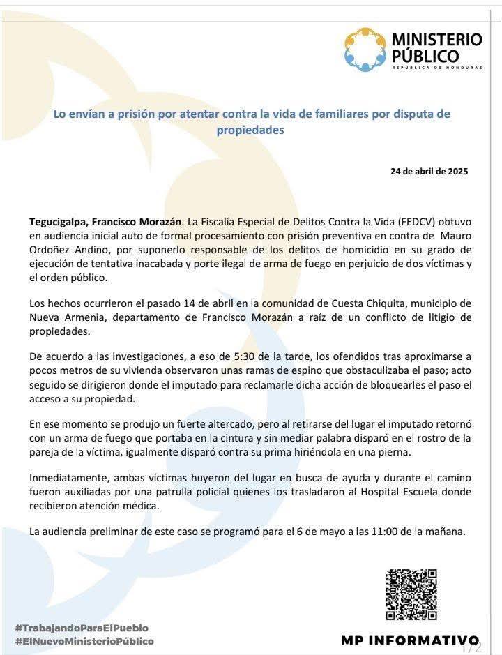 Tegucigalpa, Francisco Morazán – La Fiscalía Especial de Delitos Contra la Vida (FEDCV) obtuvo auto de formal procesamiento con prisión preventiva contra Mauro Ordoñez Andino, acusado de tentativa inacabada de homicidio y porte ilegal de arma de fuego.