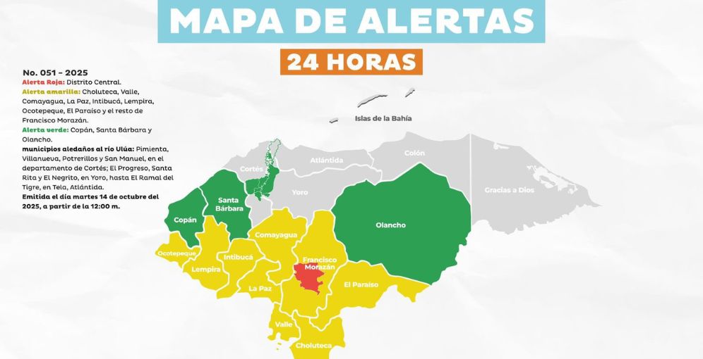 Los departamentos bajo alerta amarilla son Choluteca, Comayagua, Valle, La Paz, Intibucá, Lempira, Ocotepeque, El Paraíso y el resto de Francisco Morazán. Por su parte, la alerta verde abarca zonas de Cortés, El Progreso, Santa Rita y El Negrito en Yoro, así como desde el Ramal del Tigre en Tela hasta partes de Atlántida.