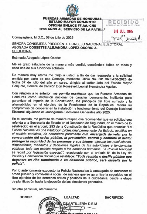 A pesar de ello, el general Hernández reafirmó que las Fuerzas Armadas siguen comprometidas con acompañar el proceso electoral, de acuerdo con lo establecido en el cronograma oficial.