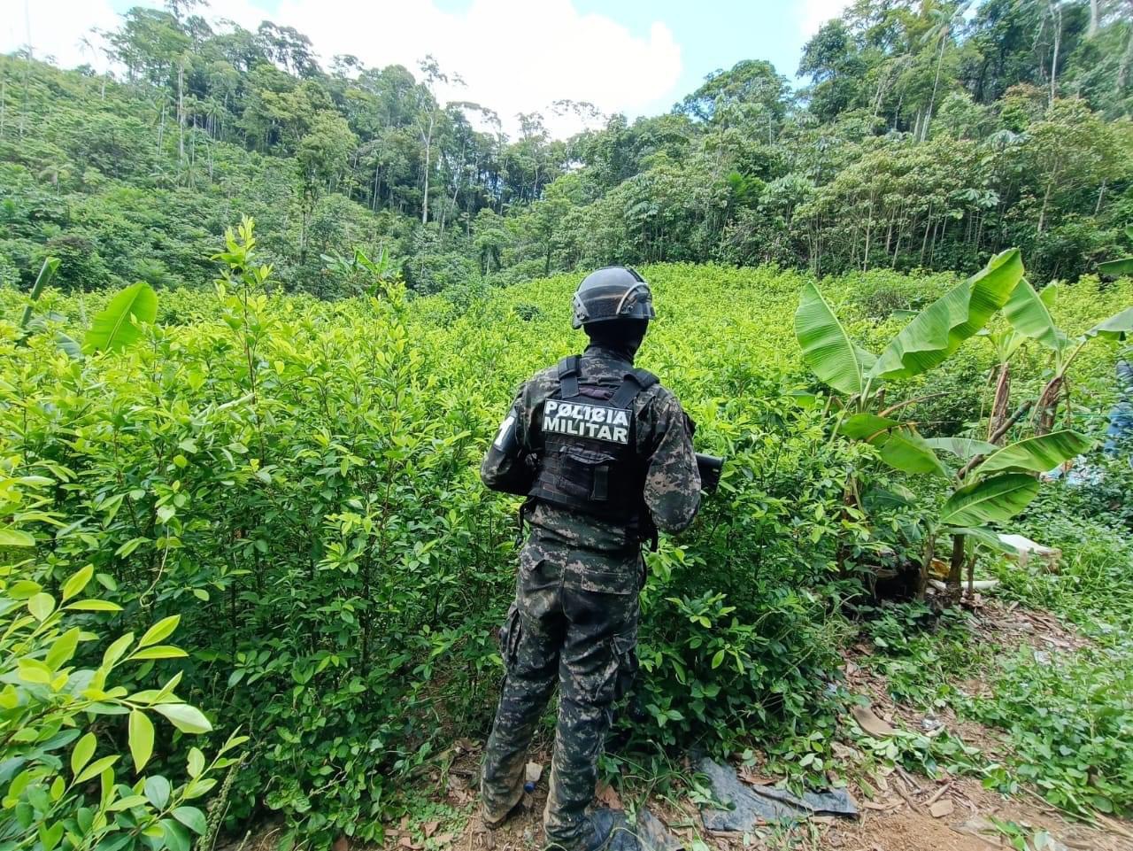 Colón.- Las Fuerzas Armadas (FFAA), empleando unidades especiales de investigación de la Dirección de Información Estratégica y unidades operativas de la Policía Militar del Orden Público (PMOP), el 27 de abril de 2024, en el Sector de Cerro Azul, de la Biosfera del Rio plátano departamento de Colón, se ubicó y aseguró una plantacion con extensión de aproximadamente (35) manzanas de tierra cultivada supuestamente con arbustos de coca con una aproximado de 180 mil plantas.