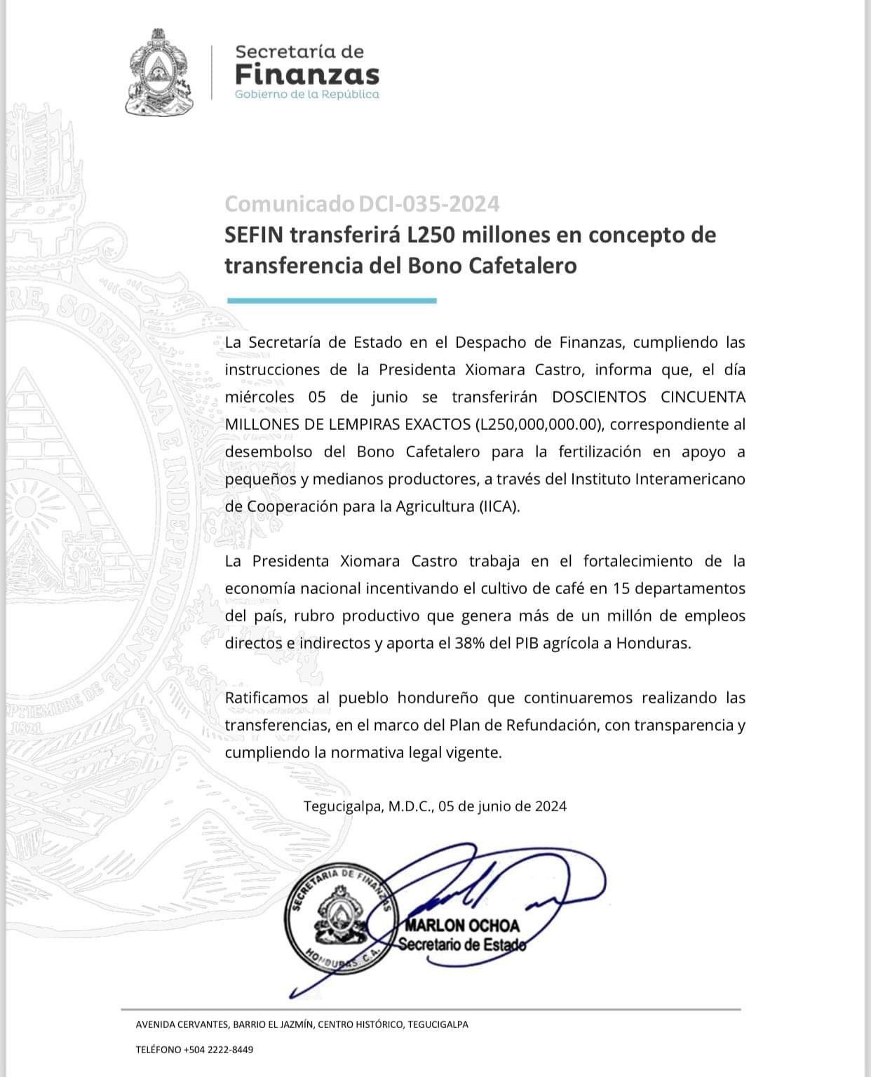 El comunicado DCI-035-2024 refirió que “la Secretaría de Estado en el Despacho de Finanzas, cumpliendo las instrucciones de la Presidenta Xiomara Castro, informa que, el día miércoles 5 de junio se transferirán 250 millones de lempiras correspondiente al desembolso del Bono Cafetalero para la fertilización en apoyo a pequeños y medianos productores, a través del Instituto Interamericano de Cooperación para la Agricultura (IICA)”.