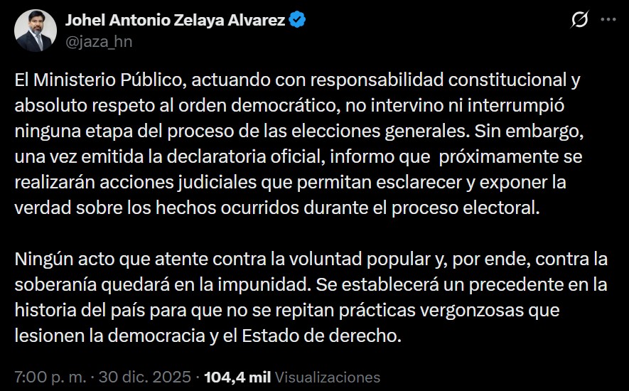 A través de la red social X, Zelaya aseguró que la Fiscalía actuó con responsabilidad constitucional y absoluto respeto al orden democrático, subrayando que no intervino ni interrumpió ninguna de las etapas del proceso electoral.