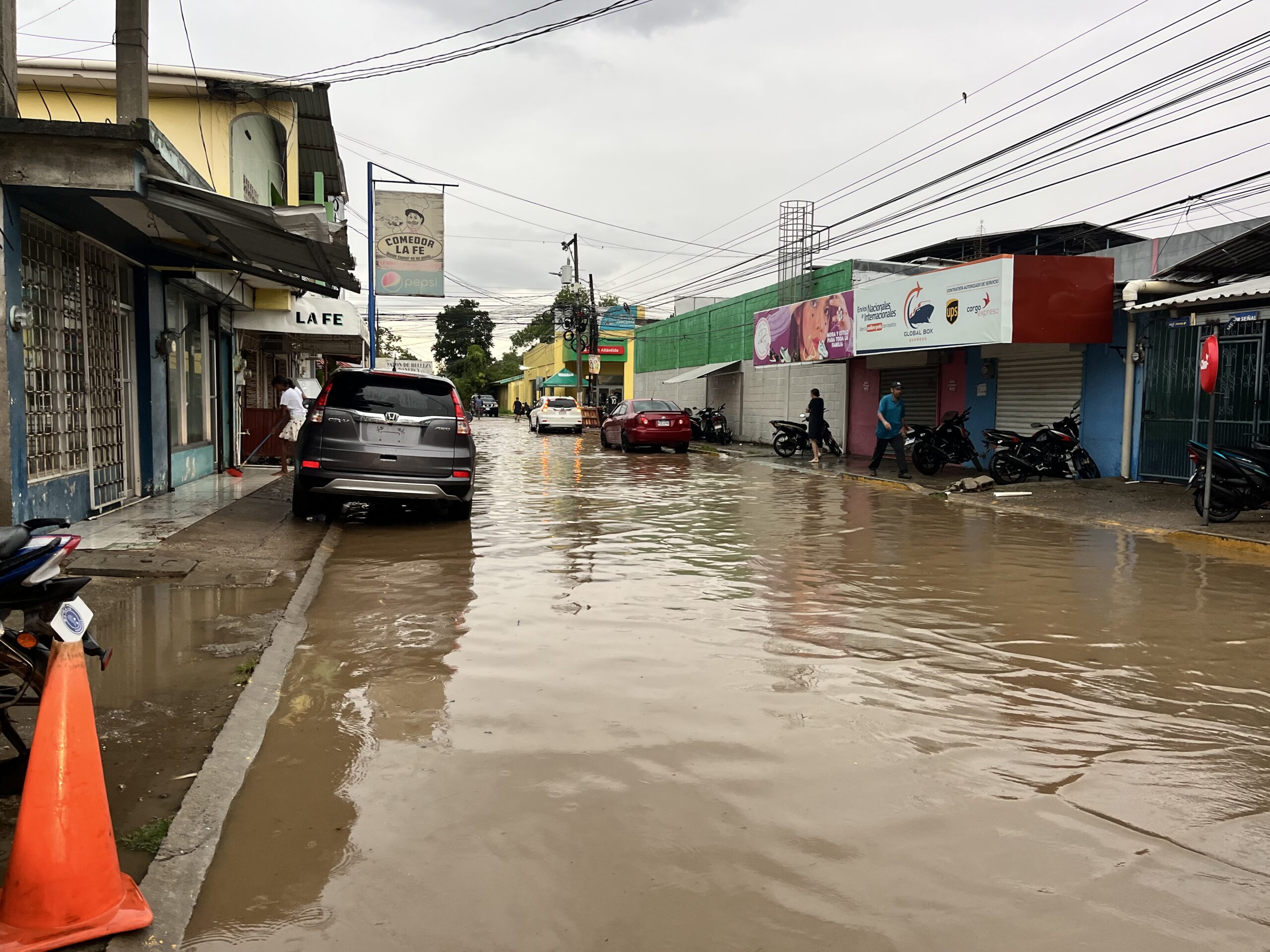 Más de 3 horas de lluvias provocaron inundaciones en la avenida Francisco Morazan , varios comerciantes tuvieron que sacar agua de sus negocios .