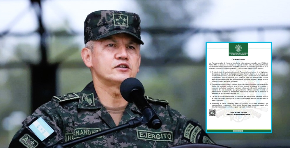 Las Fuerzas Armadas de Honduras (FFAA) informaron que, tras la divulgación de audios por parte del Ministerio Público en los que se señala a un supuesto miembro activo de la institución involucrado en planes para boicotear las elecciones generales del próximo 30 de noviembre, se ha conformado una comisión investigadora para esclarecer los hechos y poner a disposición de la justicia al responsable.