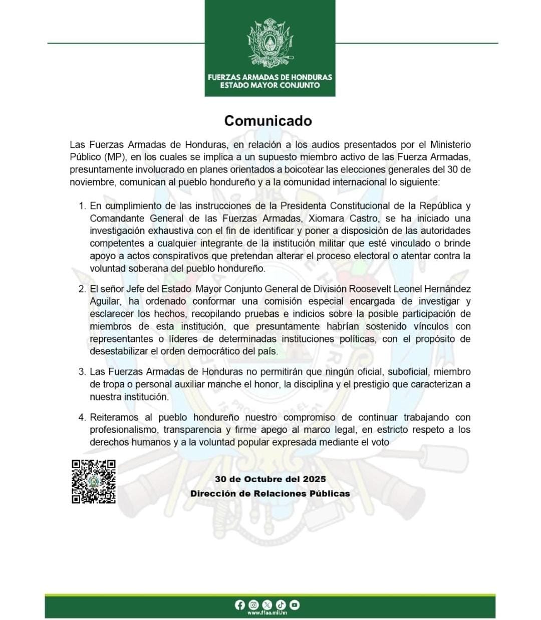 En un comunicado oficial, la institución indicó que, por instrucciones de la presidenta constitucional y comandante general, Xiomara Castro, se ha iniciado una investigación exhaustiva para identificar y sancionar a cualquier integrante de las FFAA que participe o brinde apoyo a actos conspirativos que pretendan alterar el proceso electoral o atentar contra la voluntad del pueblo hondureño.