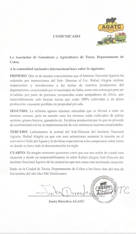Tocoa, Colón – La Asociación de Ganaderos y Agricultores de este Municipio,emitió este martes un contundente comunicado en el que denuncia al subdirector del Instituto Nacional Agrario (INA), Rafael Alegría, por presuntamente promover la invasión de tierras productivas en el departamento de Colón.