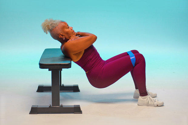 Ejecución: Apoya la espalda sobre un banco, pies apoyados en el suelo, eleva las caderas contra la minibanda y desciende lentamente, manteniendo la tensión en los glúteos.
