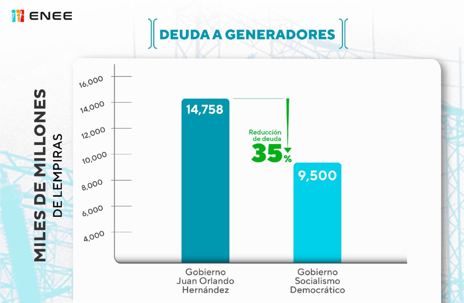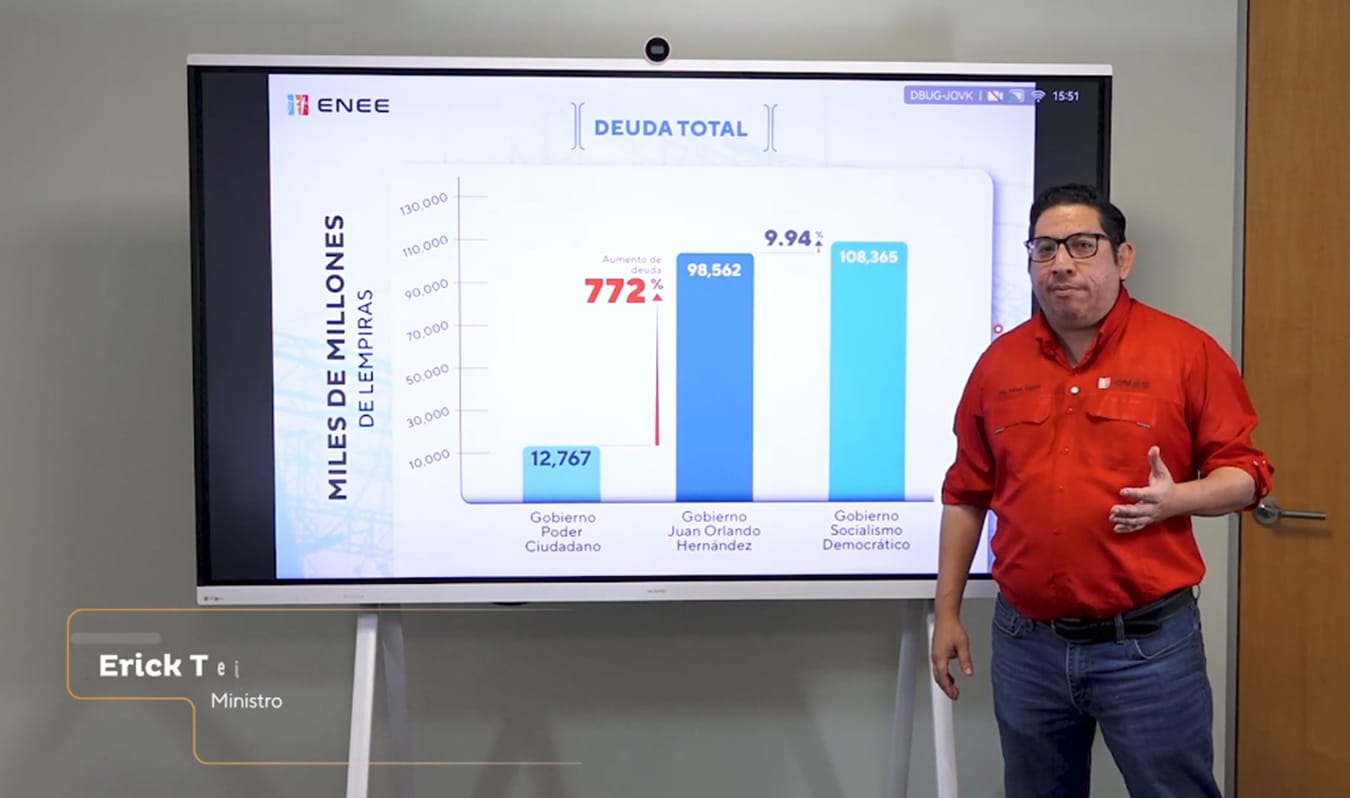 Durante la administración anterior, la deuda de la ENEE creció a un ritmo promedio anual del 64%, mientras que bajo la presidencia de Xiomara Castro, la empresa ha invertido cerca de 25 mil millones de lempiras en generación, transmisión y distribución, renegoció contratos lesivos y subsidiado a 900 mil familias con energía gratuita.