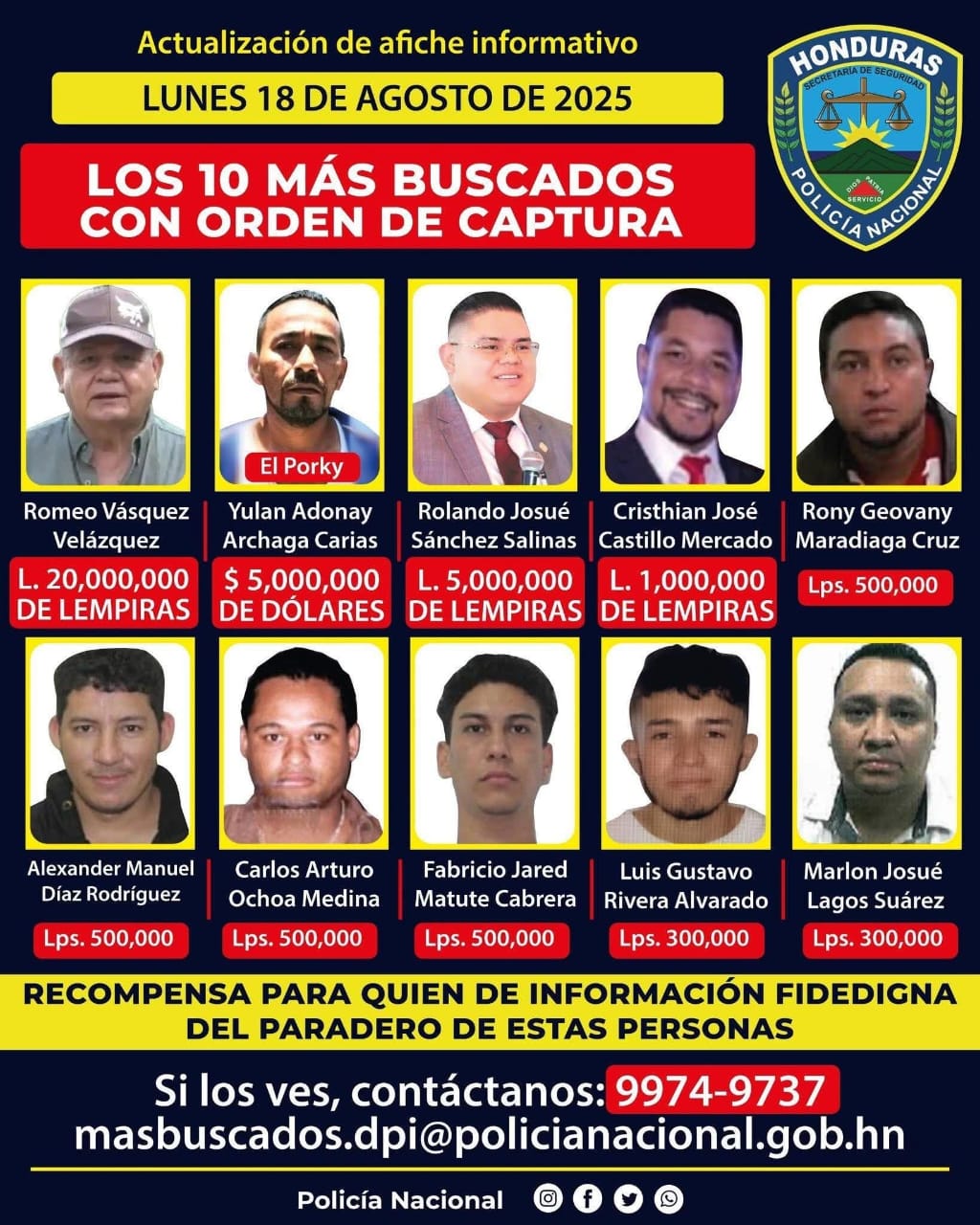 El Gobierno de Honduras, a través de la Policía Nacional, anunció este lunes que la recompensa por información que conduzca a la captura del general en condición de retiro Romeo Vásquez Velásquez se incrementó a 20 millones de lempiras, la cifra más alta ofrecida en la historia reciente del país.