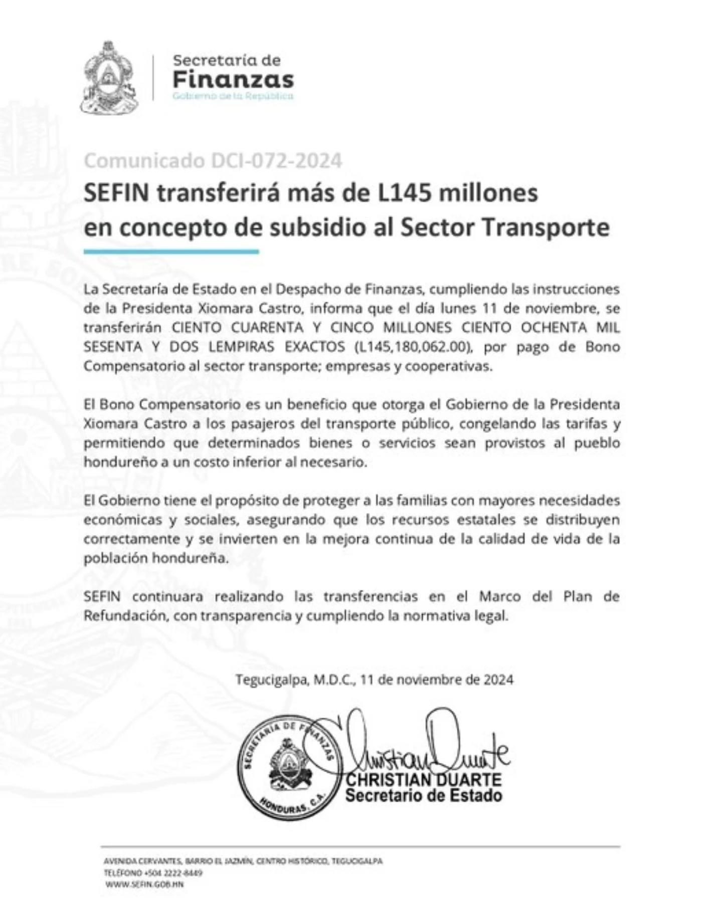 A través de un comunicado oficial, la entidad detalló que el monto exacto de 145,180,062 lempiras fue destinado al pago del Bono Compensatorio para empresas y cooperativas de transporte público.