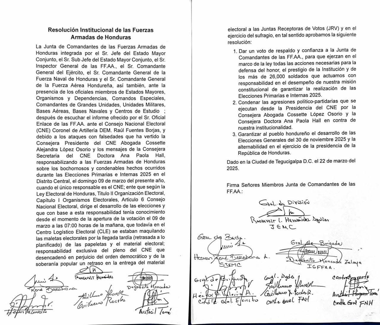 De acuerdo a un documento firmado por los principales oficiales de la institución verde olivo, determinaron respaldar a la Junta de Comandantes, al tiempo que condenaron lo que llamaron “agresiones político-partidarias” de las consejeras del CNE, Cossette López y Ana Paola Hall.