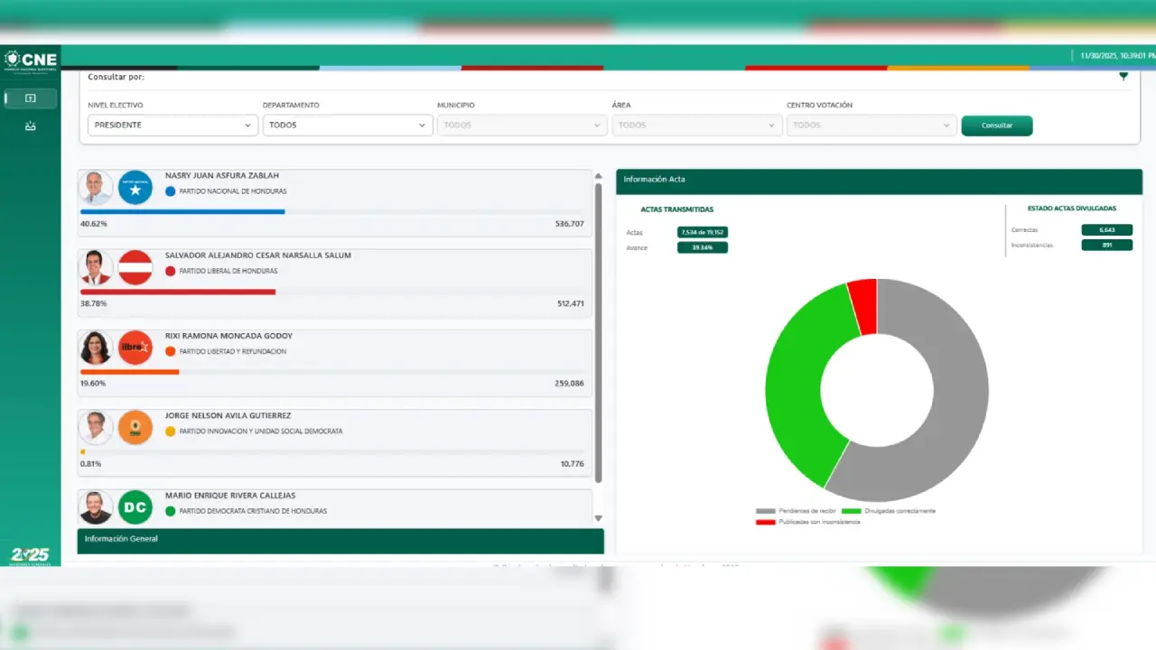 La situación técnica del TREP se suma a la incertidumbre política, ya que el Consejo Nacional Electoral (CNE) aún no ha divulgado resultados definitivos dos días después de las elecciones. Hasta el último corte, con el 57.03 % de las actas procesadas, la diferencia entre Nasry Asfura y Salvador Nasralla es mínima, generando un virtual empate técnico. La candidata de Libre, Rixi Moncada, ocupa el tercer lugar con el 19.16 %.