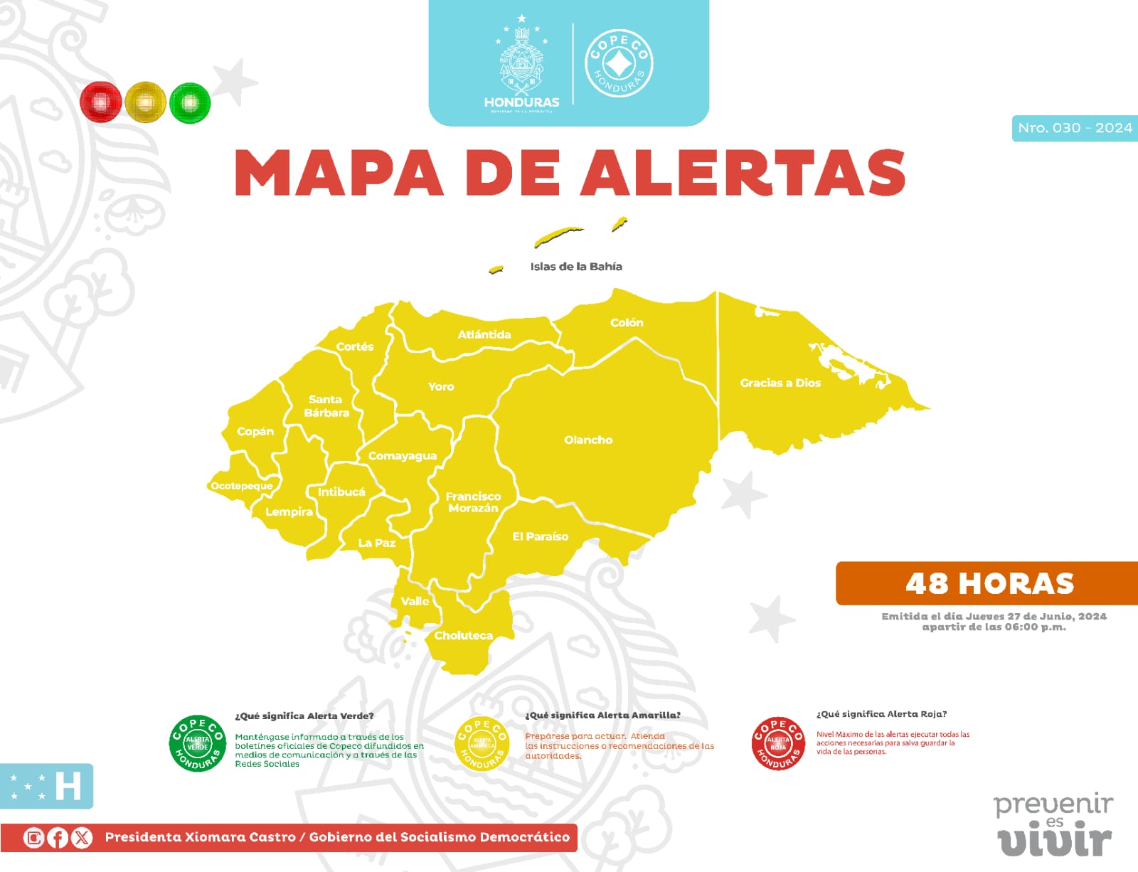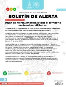 La Comisión Permanente de Contingencia (Copeco), advierte que el mal tiempo dejará fuertes lluvias en varias regiones del país. Por lo que emitió la alerta amarilla por 48 horas, entrando en vigencia desde las 6:00 pm de este jueves 27 de junio.
