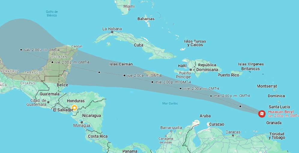 Según el Centro de Estudios Atmosféricos, Oceanográficos y Sísmicos (CENAOS), Beryl ingresó al mar Caribe, siempre como categoría 4, con vientos de 240 km por hora y se desplaza hacia el oeste a 31 km por hora.