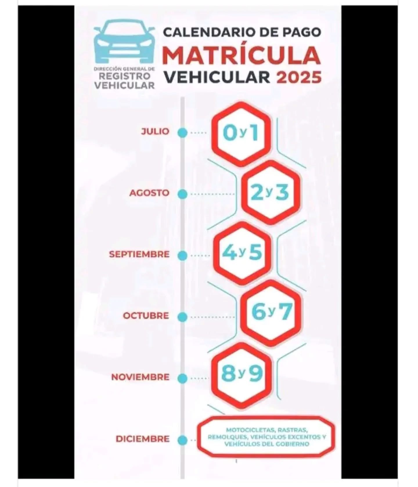 El calendario de pago establecido por terminación es en julio para 0 y 1, en agosto 2 y 3, en septiembre 4 y 5, en octubre 6 y 7, en noviembre 8 y 9, y en diciembre motocicletas, rastras, remolques, vehículos exentos y vehículos del gobierno.