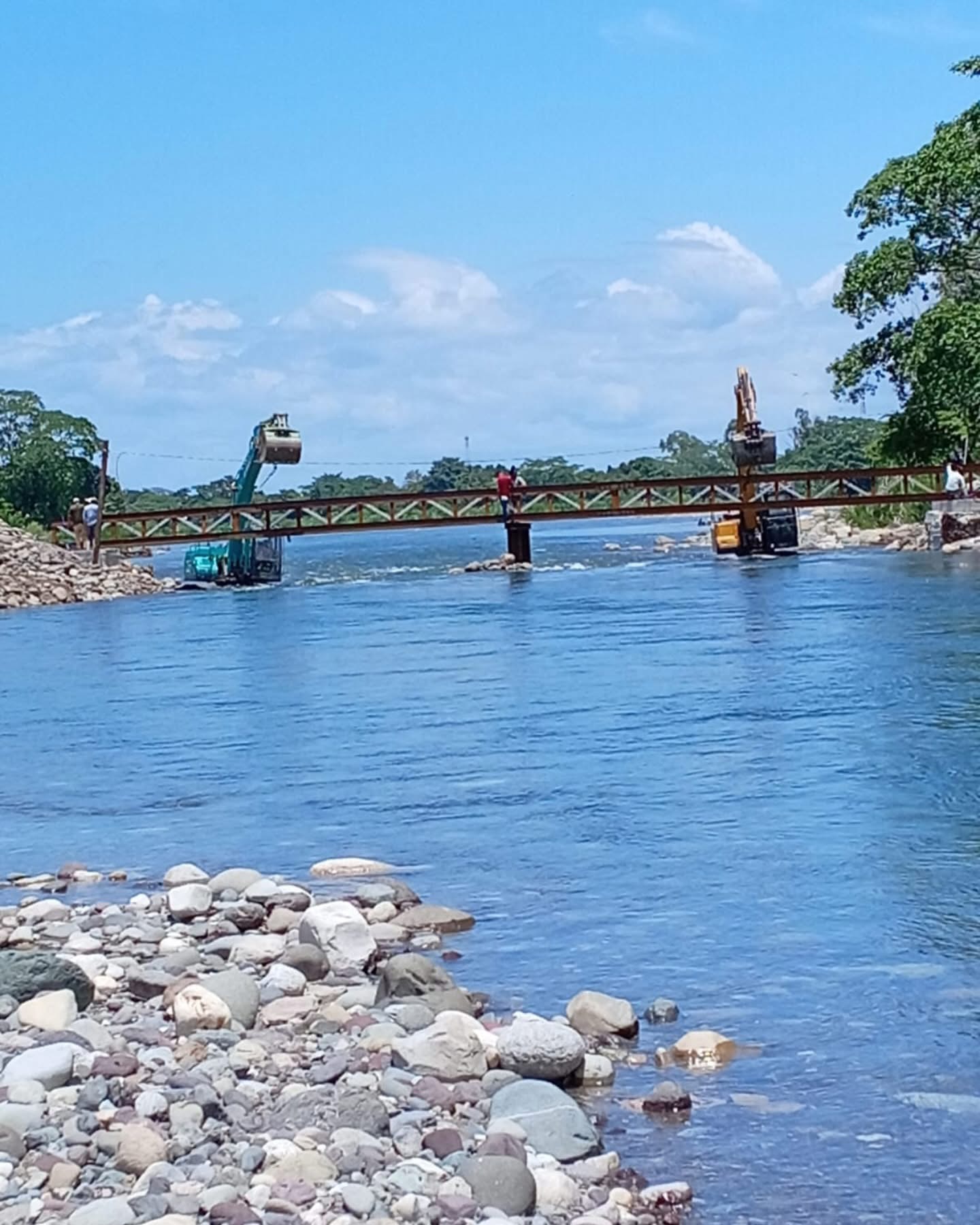 La Ceiba. Como un alivio a las interminables filas de vehículos que se tienen todos los días para cruzar del sector este al centro de la ciudad y viceversa se ve la instalación del puente Bailey en el vado sobre el río Cangrejal.
