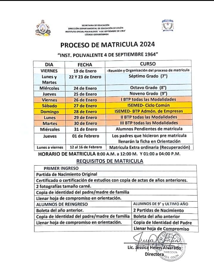 Los horarios de matrícula son de 8 de mañana a 12 del mediodía y de 1 a 4 de la tarde.