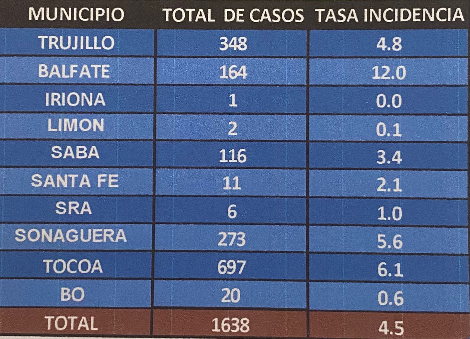Con este caso ya los 10 municipios de este departamento de Colón  siendo los municipios de Tocoa, Trujillo,  Sonaguera,  Balfate y Saba  con más   casos.