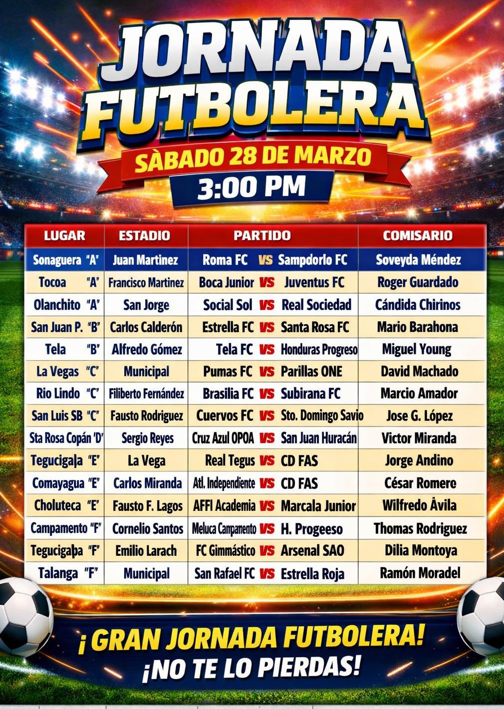 GRUPO A: En Sonaguera se dispuat el clásico entre Roma FC y Sampdoria, mientras en Tocoa, Boca Junior esperal Juventus y en Olanchito, Real Sociedad visita a Social Sol.