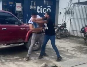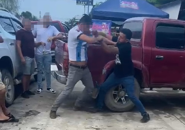 El penoso suceso que fue grabado en video por curiosos, se ve como dos sujetos: uno vestido con la camisa del 10 del Real Madrid y con pantalón gris, y el otro de camisa azul oscuro y pantalón más claro, se enfrentan en una riña callejera hace unas dos semanas.