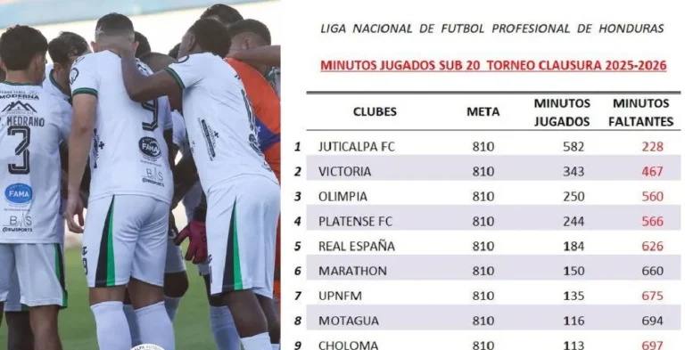 El Juticalpa FC avanza bien en el cumplimiento de los minutos obligatorios para jugadores sub-20. Tras seis jornadas, acumula 582 de los 810 requeridos, siendo Yair Medrano el mayor contribuyente. En comparación, otros equipos como Victoria y Olimpia están más rezagados, mientras que Génesis es el que menos minutos suma. En total, los clubes han registrado 2,249 minutos de los 9,000 necesarios.