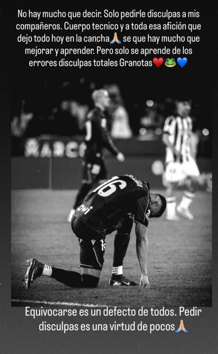 “No hay mucho que decir. Solo pedir disculpas a mis compañeros, al cuerpo técnico y a toda la afición que dejó todo hoy en la cancha. Sé que hay mucho por mejorar y aprender, pero solo se crece a partir de los errores. Disculpas totales, granotas”.