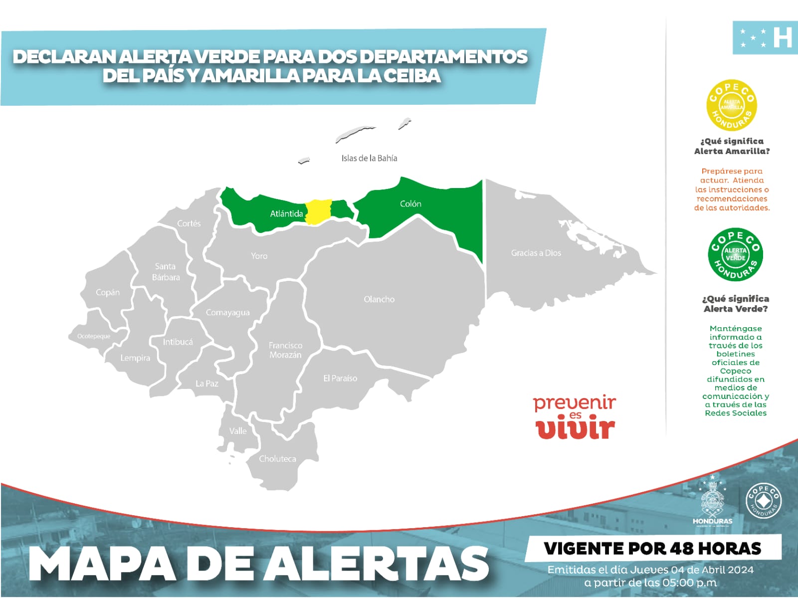La Ceiba. La Secretaría de Estado en los Despachos de Gestión de Riesgos y Contingencias Nacionales, declara Alerta Amarilla, para la ciudad de La Ceiba del departamento de Atlántida y Alerta Verde para el resto del mismo departamento y para Colón, por un período de 48 horas, a partir de las 5:00 de la tarde de hoy jueves 4 de abril 2024.