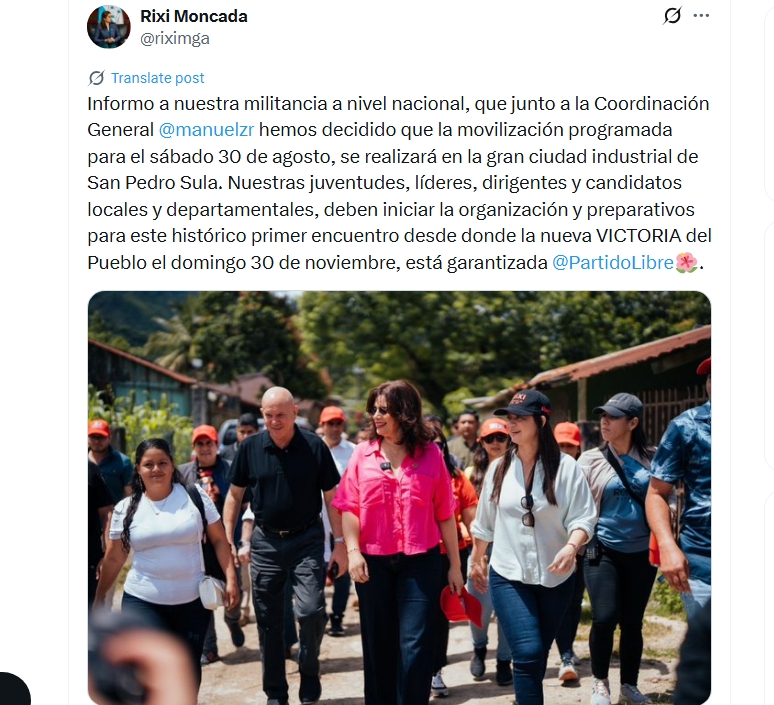 “Informo a nuestra militancia nacional que, junto a la Coordinación General, hemos decidido que la movilización se realice en San Pedro Sula. Nuestras juventudes, líderes, dirigentes y candidatos deben iniciar los preparativos para este histórico encuentro, desde donde la nueva victoria del pueblo, el 30 de noviembre, está garantizada”, señaló Moncada.