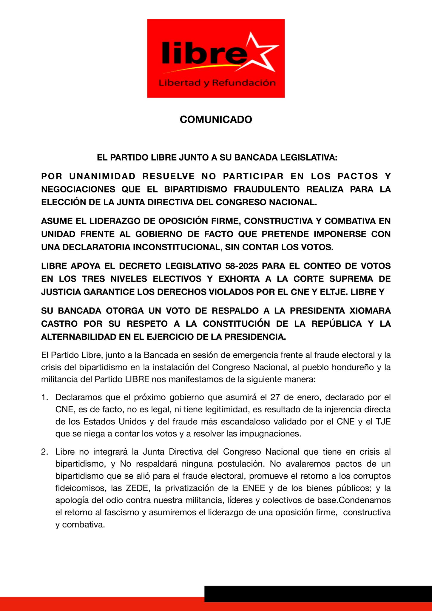 El Partido Libertad y Refundación (Libre) anunció este martes que no integrará la Junta Directiva del Congreso Nacional ni respaldará ninguna candidatura del bipartidismo para presidir el Poder Legislativo, al considerar que el proceso se desarrolla en medio de una crisis política y electoral.