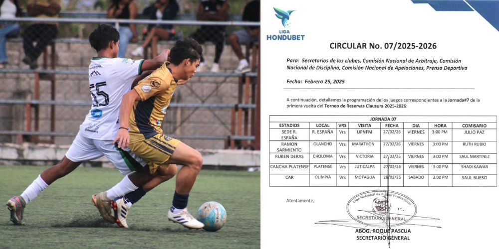 La Liga Nacional Profesional confirmó su séptima jornada del Torneo de Reservas, a desarrollarse en su mayoría este viernes 27 de febrero con horario unificado de las 3 p.m, ya que el duelo Olimpia y Motagua será hasta el sábado 28.