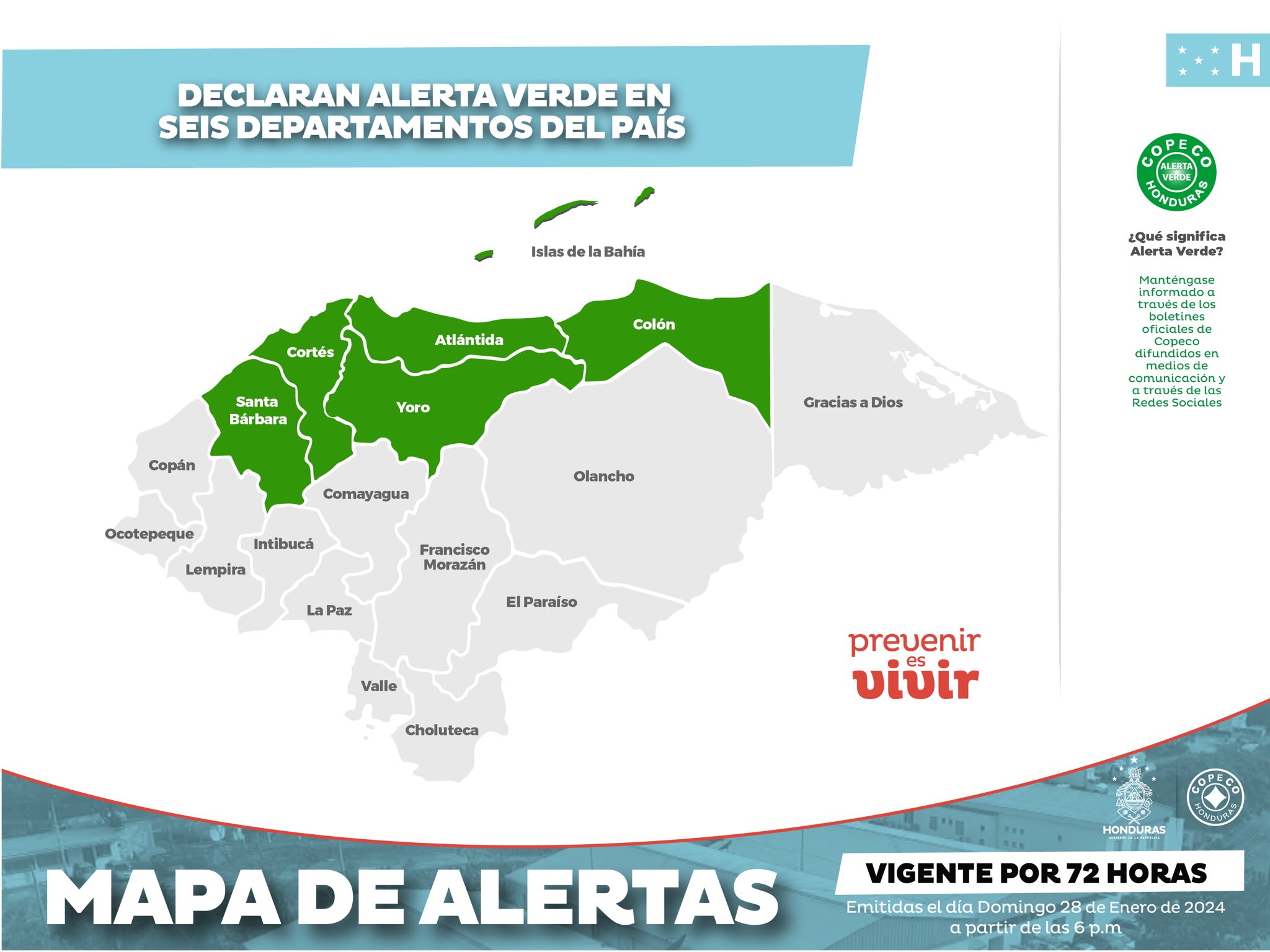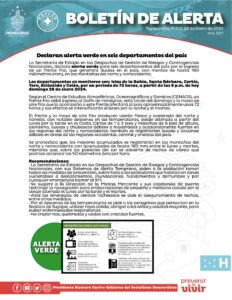 Tegucigalpa [] Una alerta por 72 hora desde las 6:00 pm de este domingo entró en vigencia en los departamentos de Colón, Atlántida, Yoro, Islas de la Bahía, Cortés y Santa Bárbara por el ingreso de un nuevo frente frío al territorio hondureño.