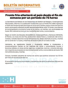 Tegucigalpa [] Un frente frío débil acompañado de una masa de aire dejará lluvias y bajas temperaturas a partir de la tarde de este domingo en gran parte del territorio hondureño.